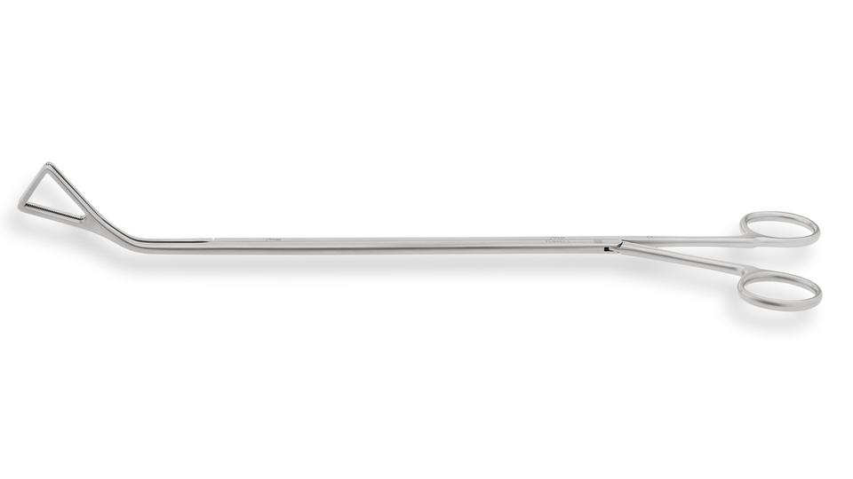 Abrazadera curva izquierda VATS Duval con mordazas triangulares dentadas, eje de 10 mm, trinquete de 15 mm, longitud de trabajo de 23,5 cm, longitud total de 34 cm - ZETOMEDPRO
