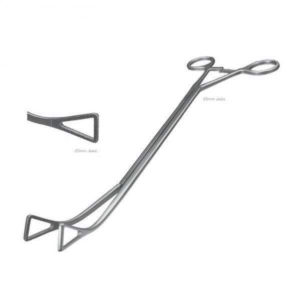 Abrazadera curva izquierda VATS Duval con mordazas triangulares dentadas, eje de 10 mm, trinquete de 25 mm, mandíbula de 23,5 cm, longitud de trabajo de 34 cm, longitud total - ZETOMEDPRO