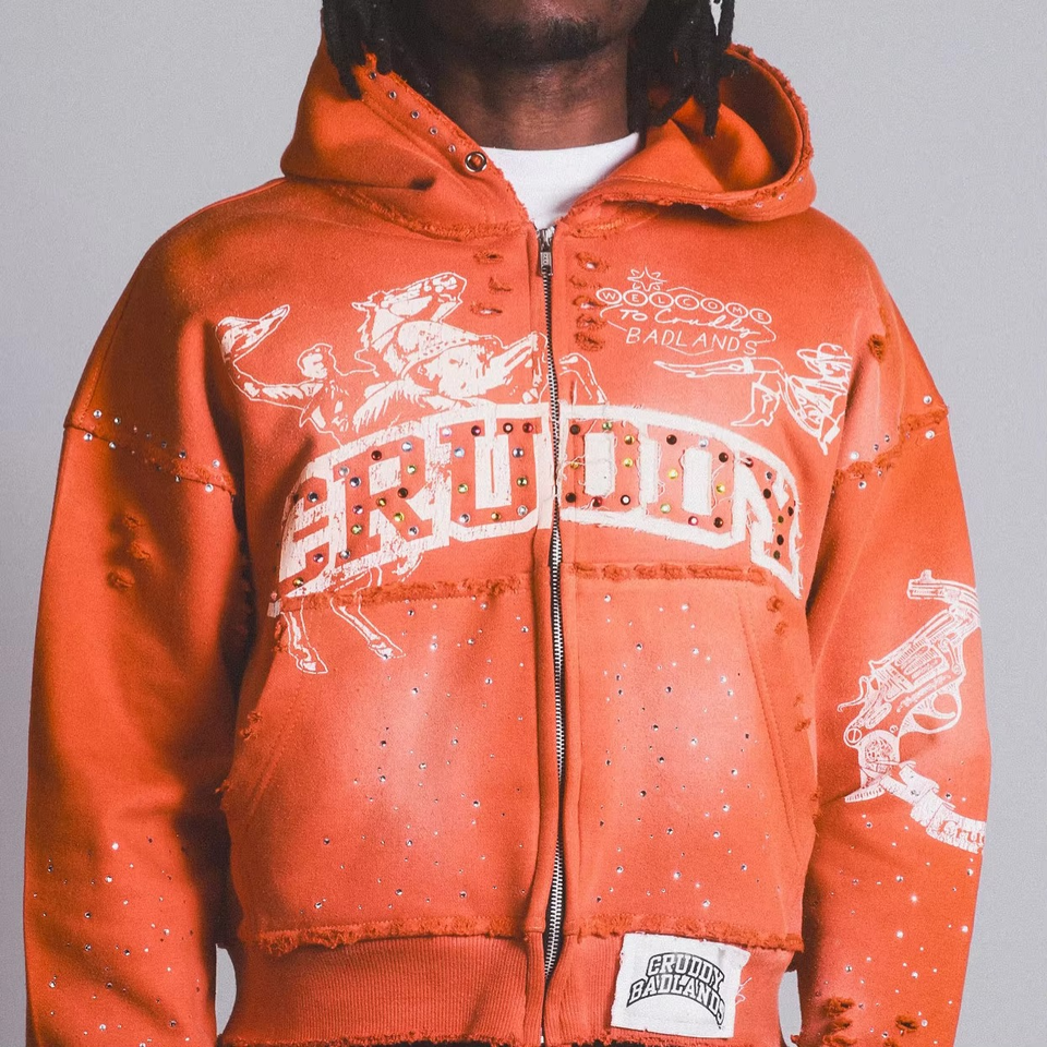 Sudadera Personalizada 100% Algodón, con Parches Desgastados, Bordado, Impresión DTG, Pedrería de Colores, Dobladillo Deshilachado, Lavado Ácido