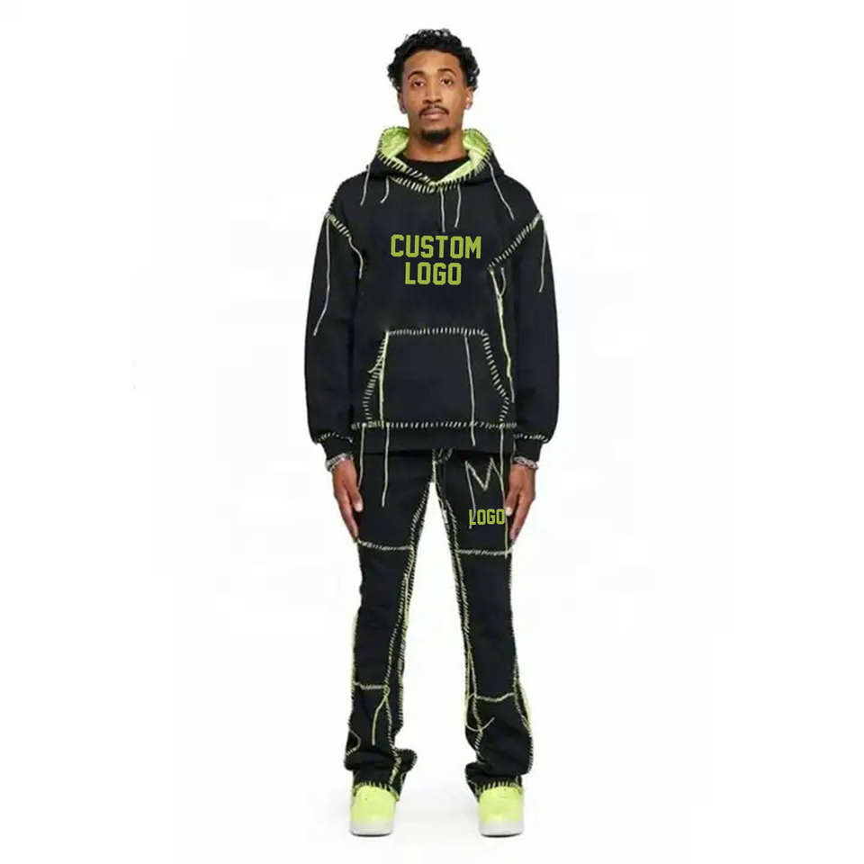 Personalizado 100% algodón acampanado chándal Sun Faded ácido lavado Jogger pantalones de chándal con capucha conjunto de alta calidad para el invierno