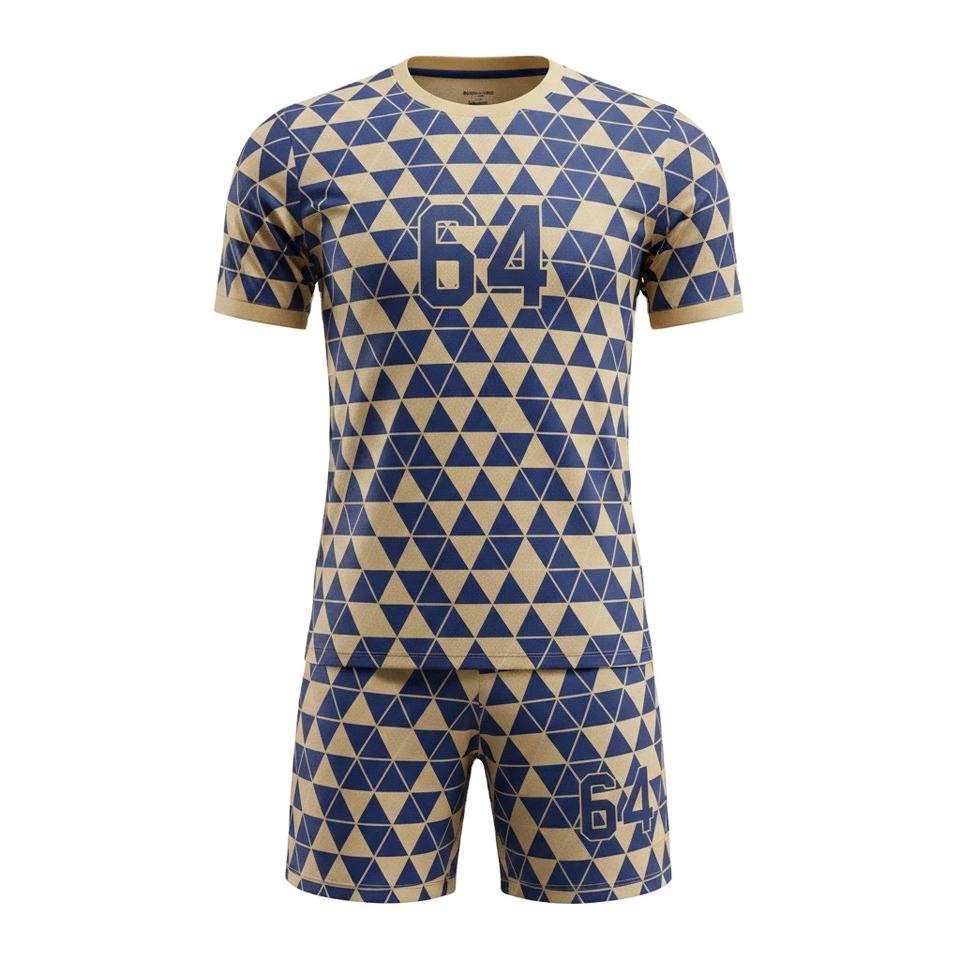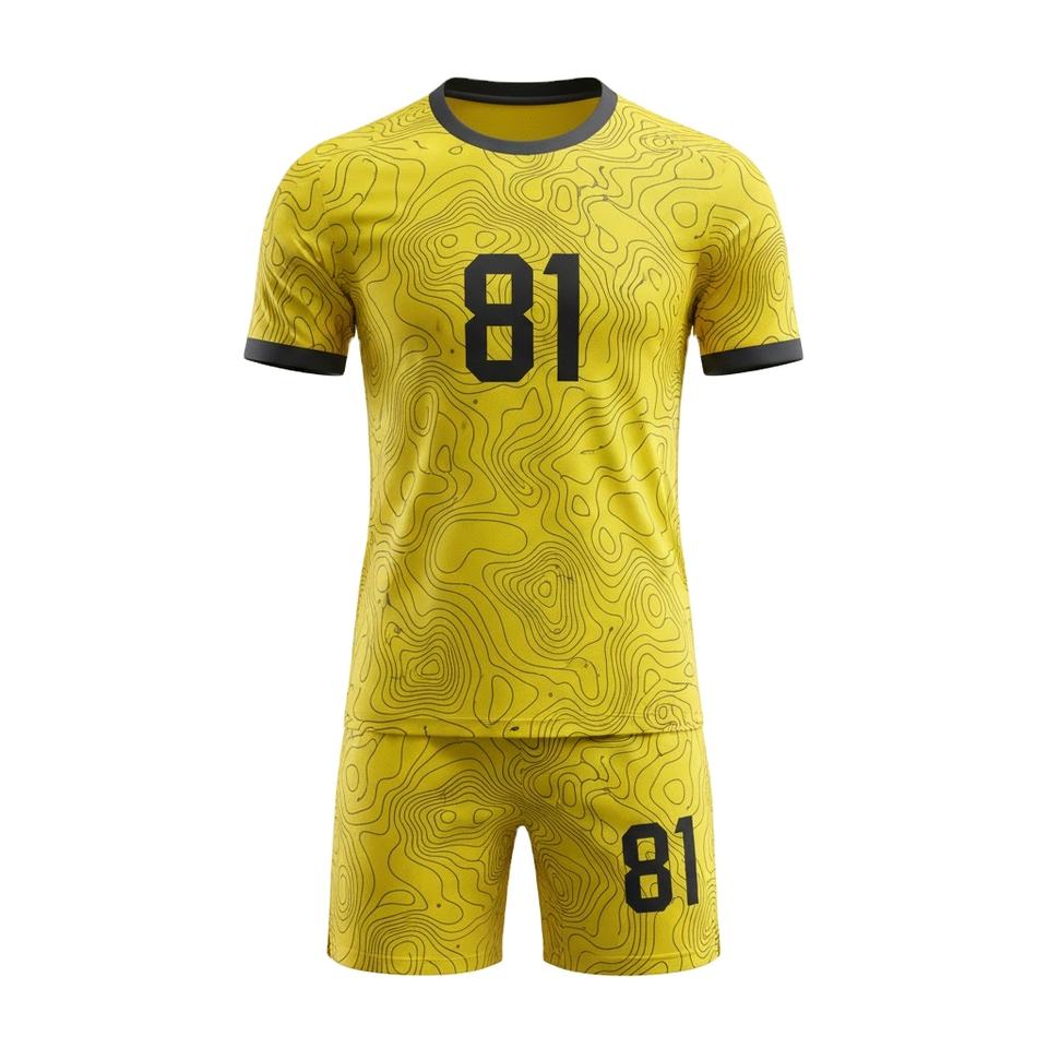Uniforme de Fútbol Sublimado Personalizado 100% Poliéster, Camiseta Amarilla con Estampado de Mapa Topográfico, Pantalones Cortos, Conjunto Completo de Ropa Deportiva para Equipo 81