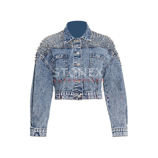 Chaqueta y abrigo de mezclilla corta de moda con remaches pesados de manga larga y solapa de Color sólido personalizado 2023 para mujer
