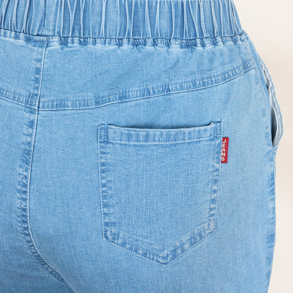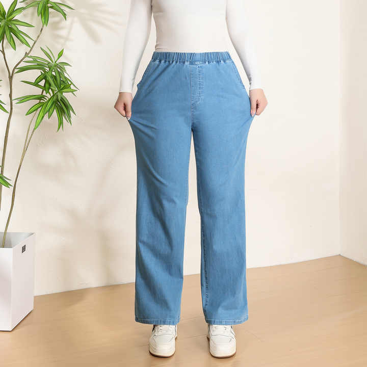 2025 personalizado de talle alto para mujer de talla grande cintura elástica pantalones vaqueros de pierna ancha corte suelto Vintage lavado ecológico pantalones vaqueros azules