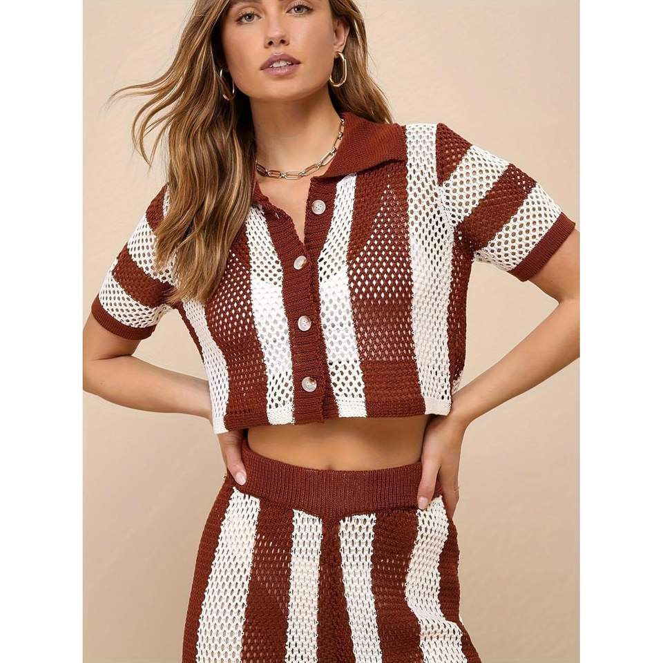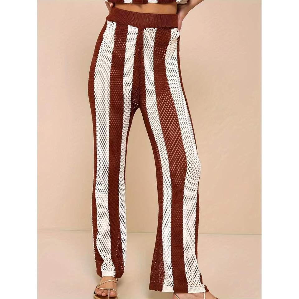 Conjunto de Dos Piezas de Crochet Personalizado 2026 para Mujer, Pantalones de Malla a Rayas, Atuendo de Playa de Verano, Transpirable, con Diseño Calado, Ropa de Moda