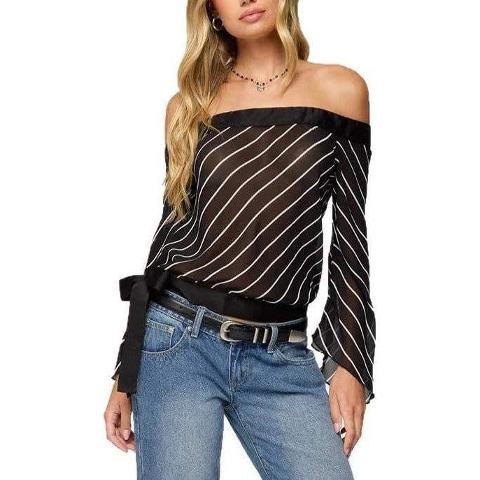 Top Personalizado 2026 con Hombros Descubiertos para Mujer, Blusa de Chifón a Rayas de Manga Larga con Lazo en la Espalda, Largo Regular
