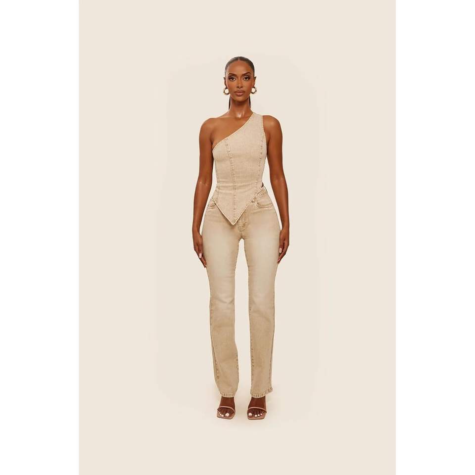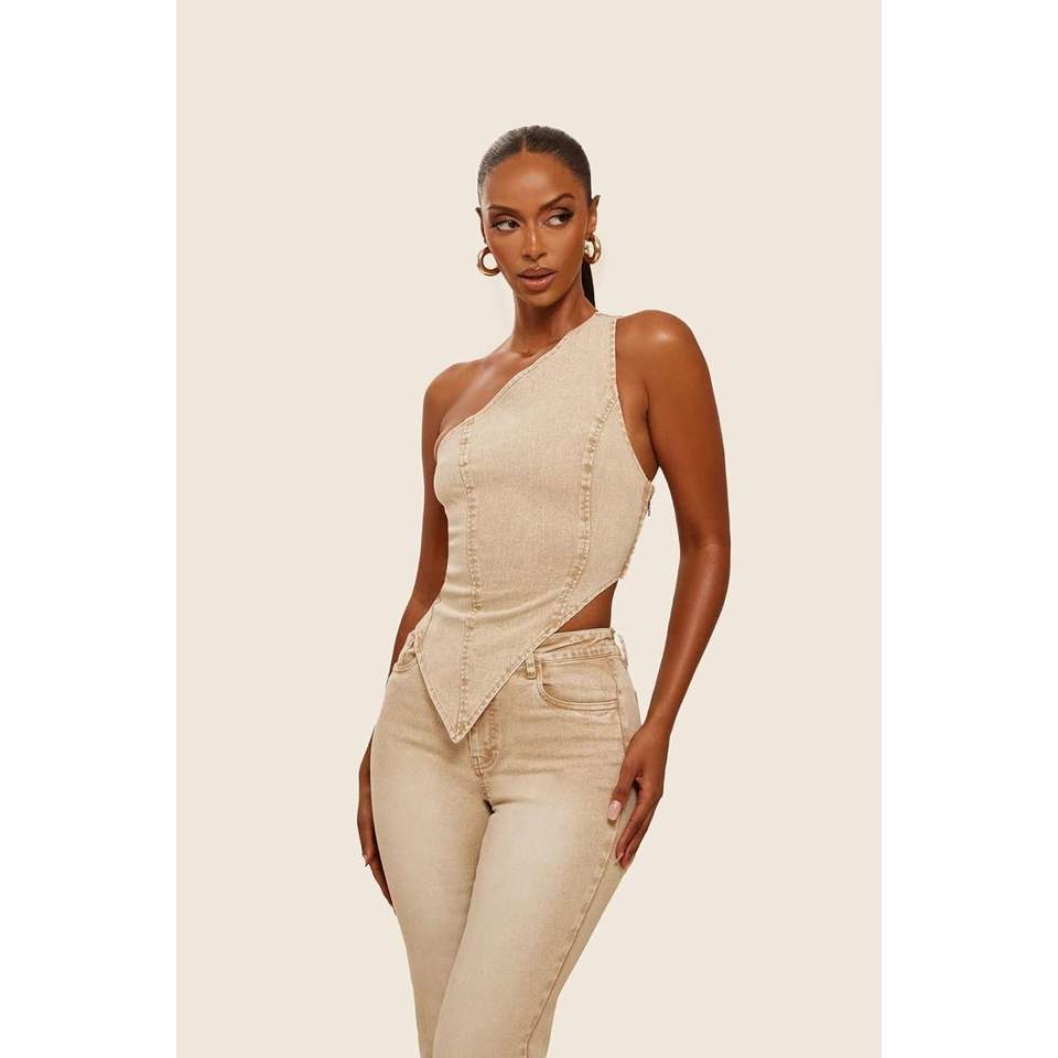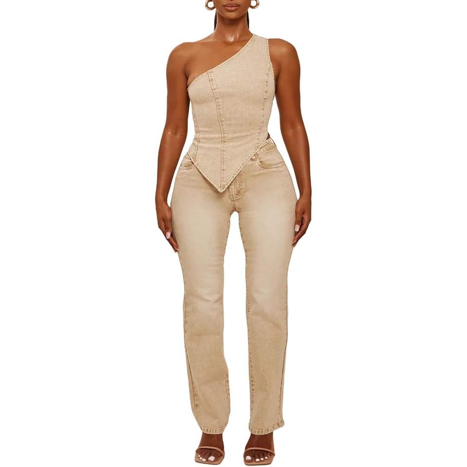 Conjunto de mezclilla personalizado 2026 para mujer: Top de un hombro y jeans con diseño recortado, transpirable, estilo Y2K, ideal para salir.
