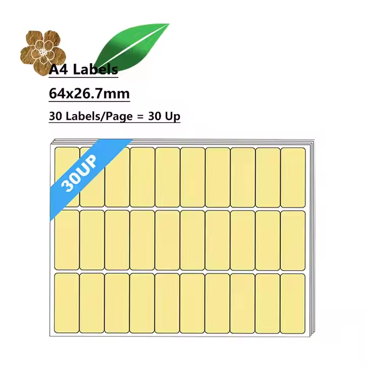 Hoja de etiquetas autoadhesiva de corte de beso de tamaño A4 30UP personalizada para embalaje de ropa para exposición de artesanía de comestibles de inyección de tinta láser