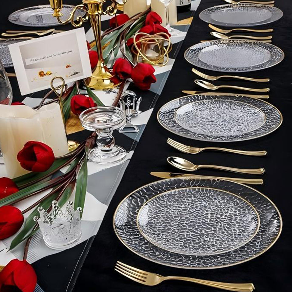 Juego de vajilla de plástico transparente desechable sostenible de alto grado con diseño de planta de oro/plata/oro rosa personalizado de 350 piezas para fiestas