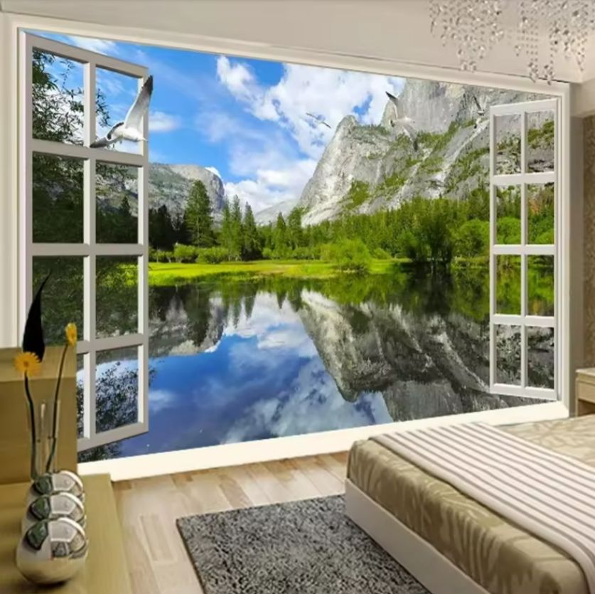 Murales 3D personalizados Ventana Clásica lago montaña naturaleza paisaje fondos sala de estar dormitorio sofá 3D pared Mural