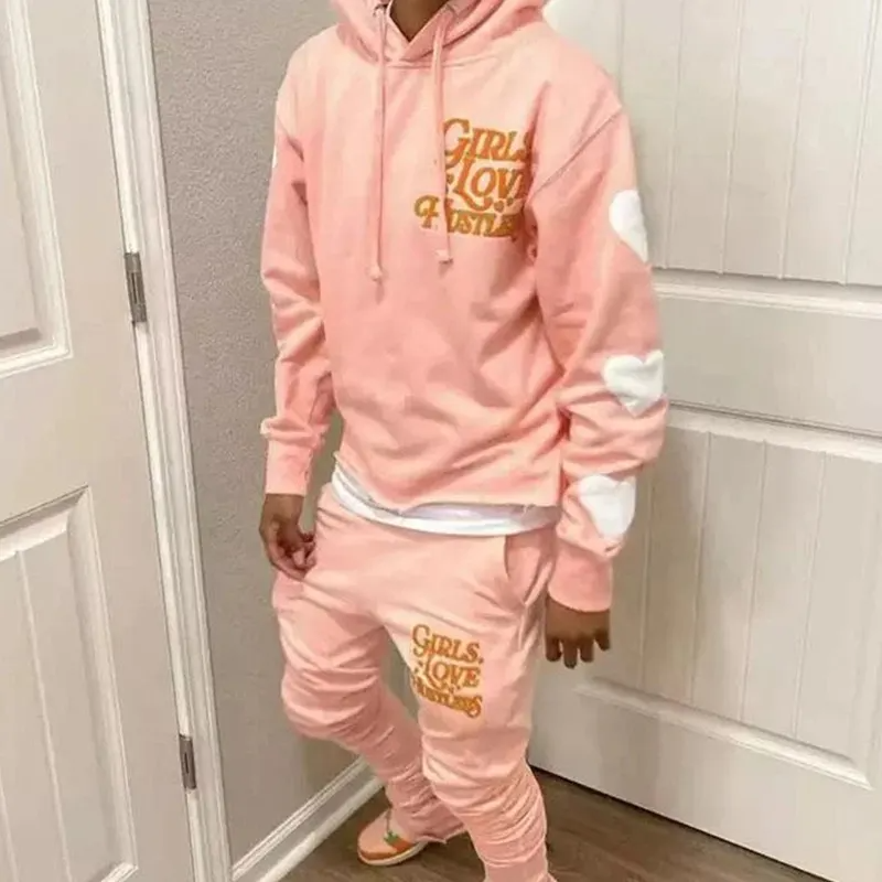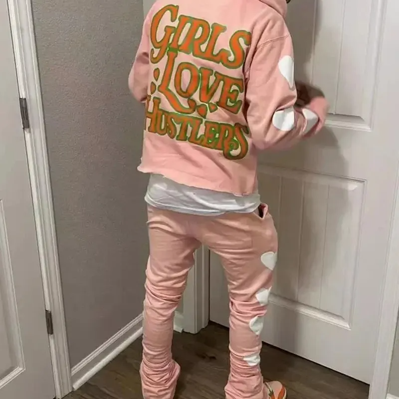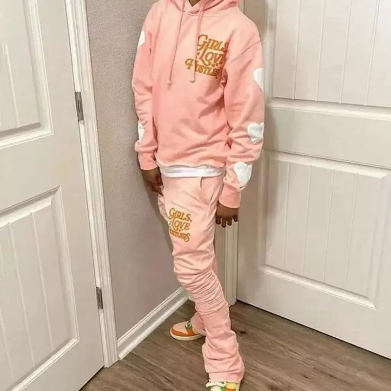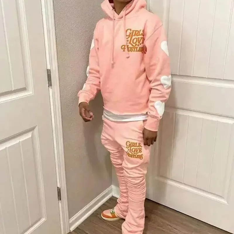 Conjunto de chándal de lana con estampado de abullonado en 3D personalizado, conjunto de pantalones de chándal acampanados de algodón de gran tamaño y Sudadera con capucha para hombre