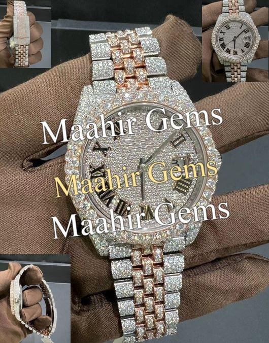 Reloj Personalizado de 40MM con Números Romanos, Cristal, Acero Inoxidable, Diamantes, Baño de Oro Rosa, Completamente Adornado con Moissanita, Resistente al Agua 10 Bar