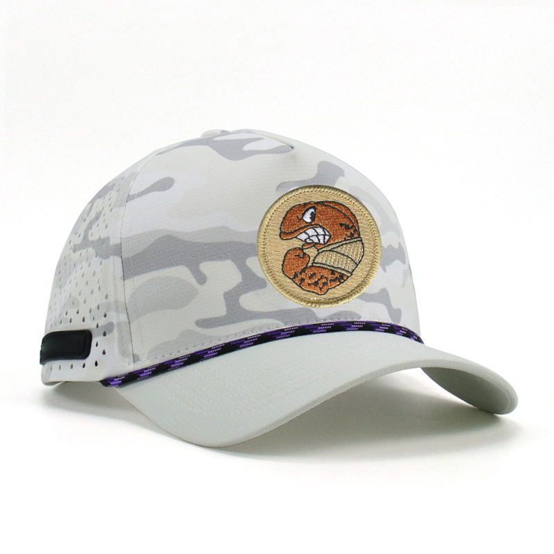 Gorra de béisbol de nuevo diseño de cuerda con logotipo de parche personalizado impermeable transpirable de secado rápido con agujero cortado con láser de 5 paneles