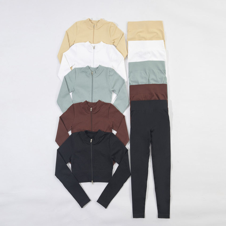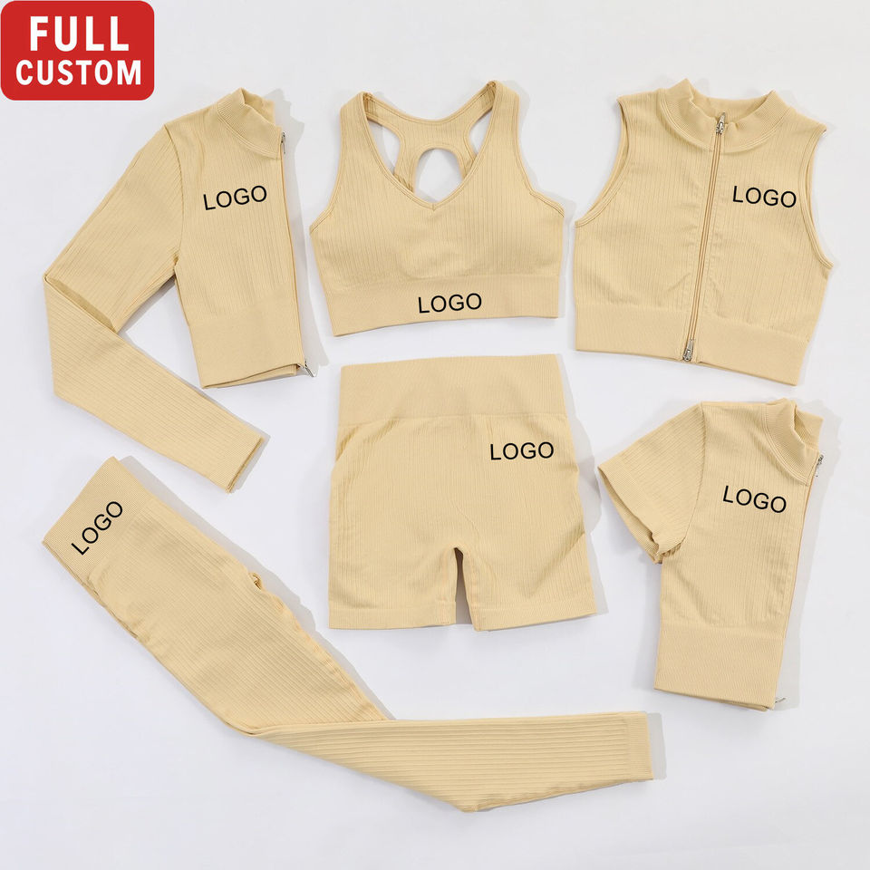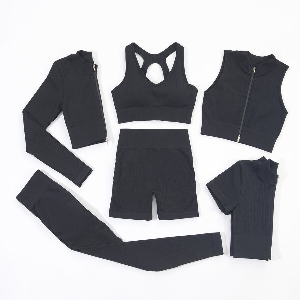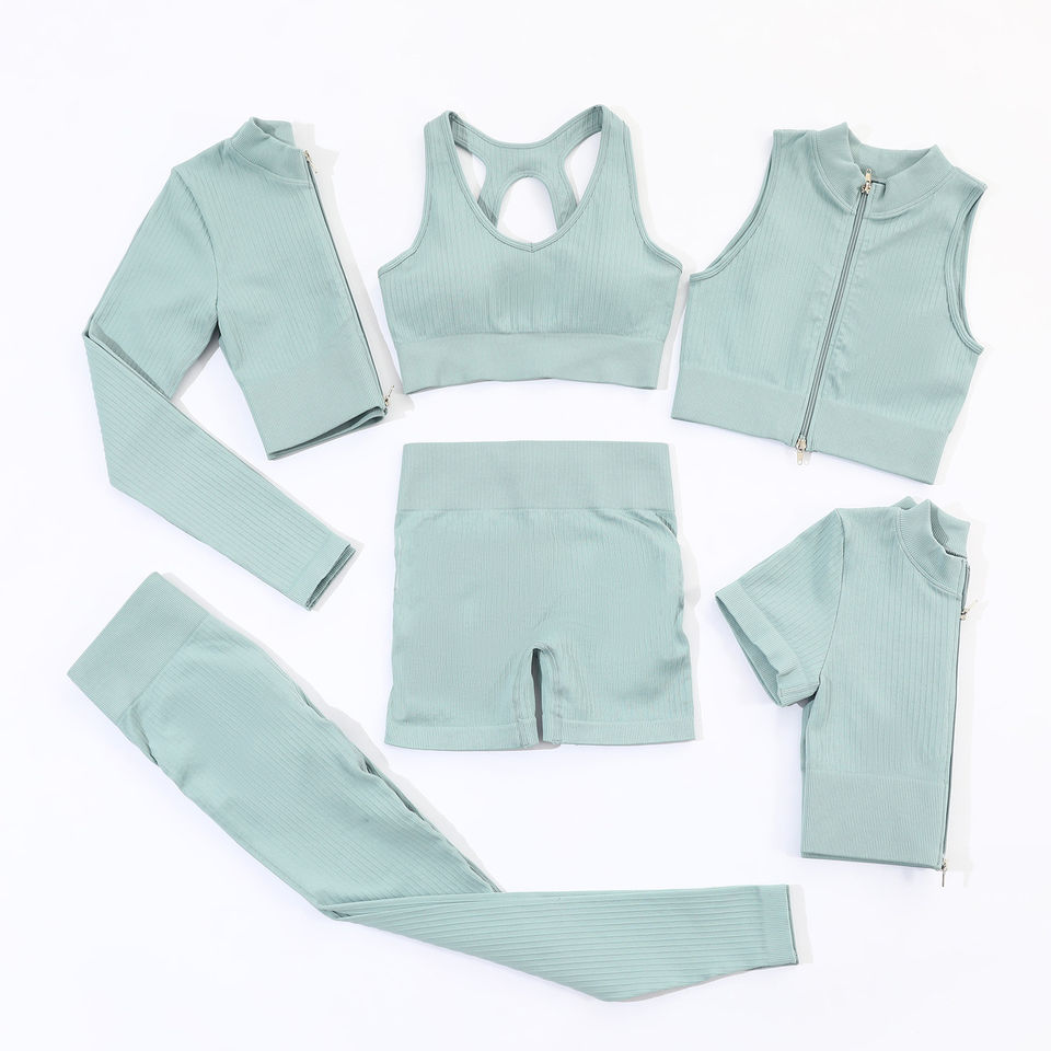 Personalizado 6 piezas acanalado Yoga Set cremallera ropa deportiva gimnasio Fitness entrenamiento sin costuras gimnasio ropa yoga Conjunto personalizado Activewear conjuntos