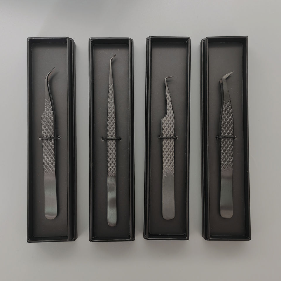 Pinzas de pestañas de acero inoxidable con agarre de fibra negra de 90 grados personalizadas