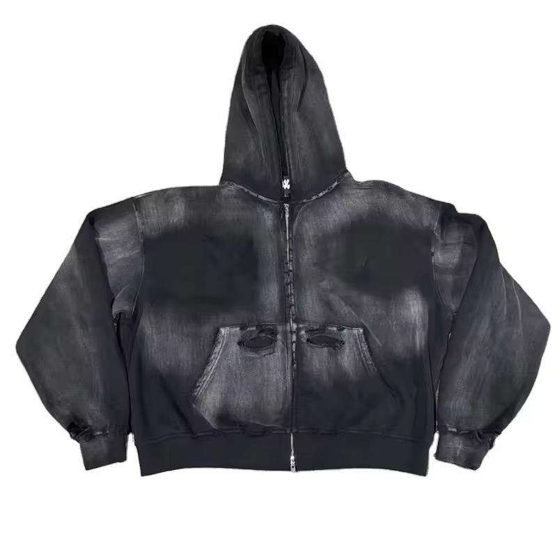 Sudadera con Capucha Corta y Holgada, Estilo Urbano, Lavado Ácido, 500GSM, Gruesa, Lisa, con Cierre, para Hombre