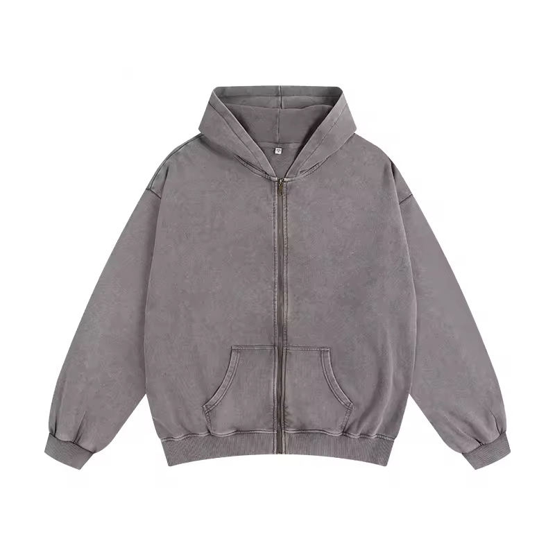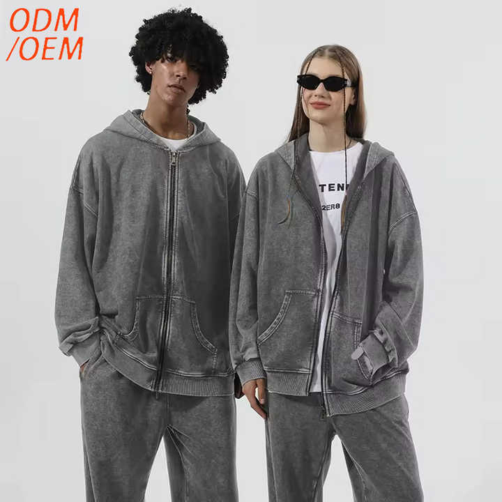 Sudadera con capucha personalizada con lavado ácido, bordado, efecto desgastado, mezcla de algodón, estilo vintage, con cremallera completa, de algodón liso