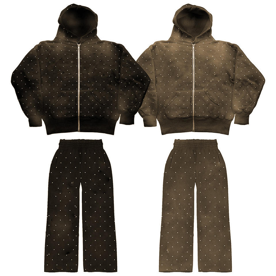 Conjunto de Chándal Personalizado con Lavado Ácido y Pedrería para Hombre, Sudadera Oversize, Pantalones Acampanados, Estampado Distressed Integral, Estilo Y2K, Venta al por Mayor