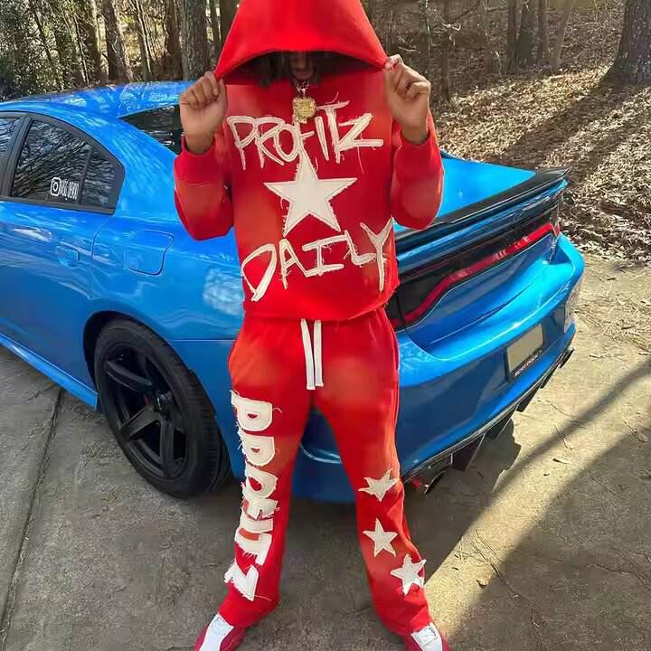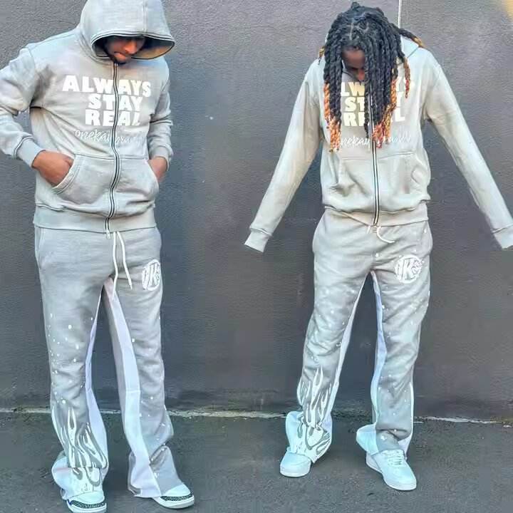 Chándales personalizados lavados al sol desteñidos para hombres con apliques de gran tamaño de peso pesado Sweatsuit pantalones de chándal acampanados y conjuntos de Sudadera con capucha