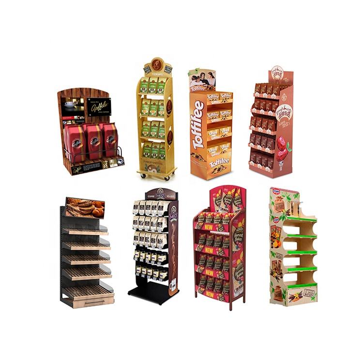 Expositor de cartón acrílico personalizado Pra Salgadinhos, piso de Metal, barra de Chocolate de madera, caja de exhibición, encimera, estante de exhibición de dulces