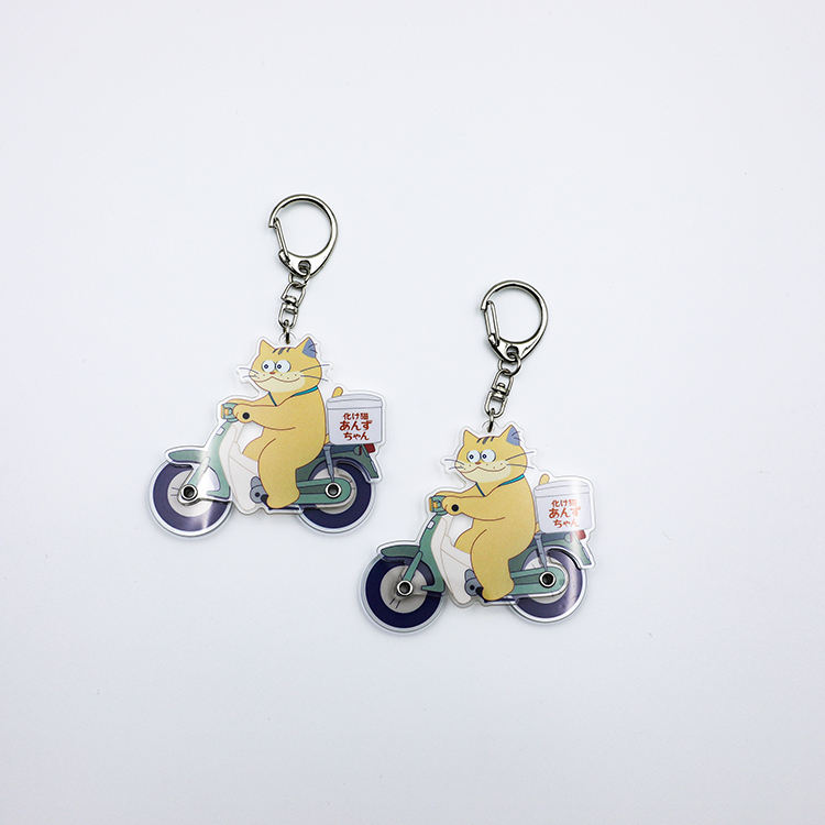 Llavero de acrílico personalizado con diseño de gato de dibujos animados, llavero ligero de acrílico con ruedas giratorias para bicicleta, llaveros de plástico
