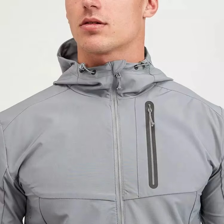 Chaqueta deportiva raglán con capucha para hombre con cremallera completa cortavientos de secado rápido de poliéster 100% de alta calidad para entrenamiento activo personalizado