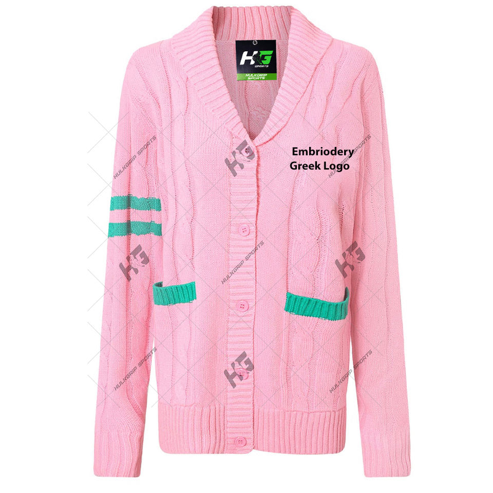 Suéteres de mujer de punto con cable de colores aprobados Alpha AKA personalizados, cárdigan con cuello en V, ropa griega de hermandad para University College