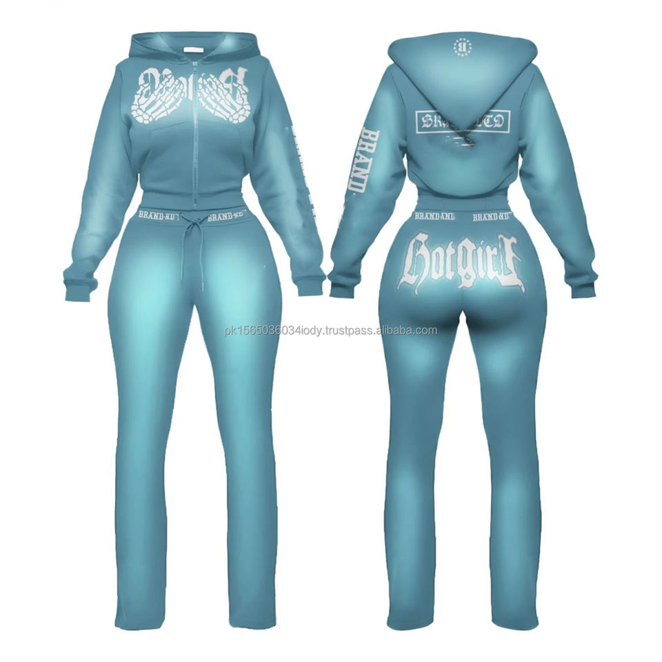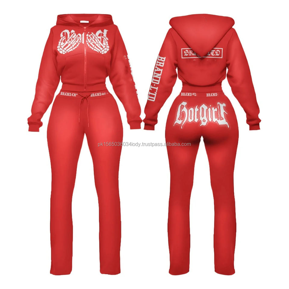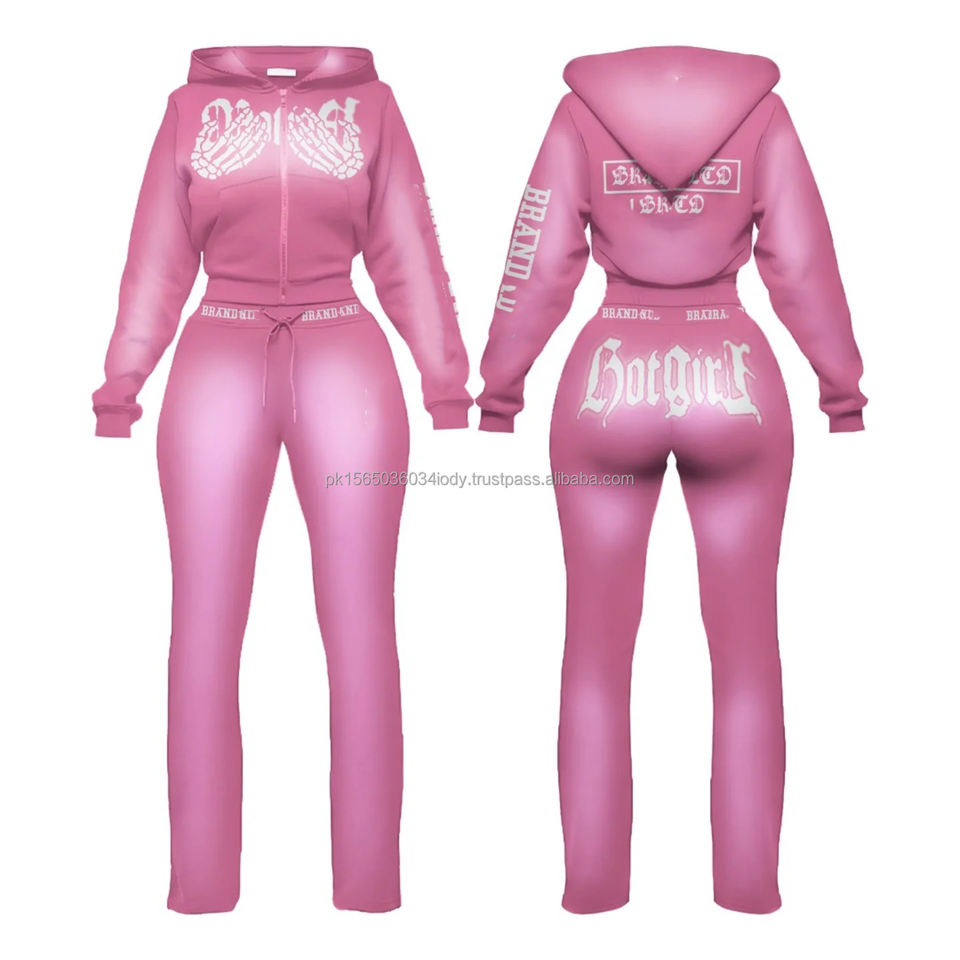 Conjunto de Sudadera y Pantalones Deportivos con Estampado de Apliques Personalizados, Lavado Ácido, con Cremallera, Pantalones Capri, Conjunto Deportivo Rosa