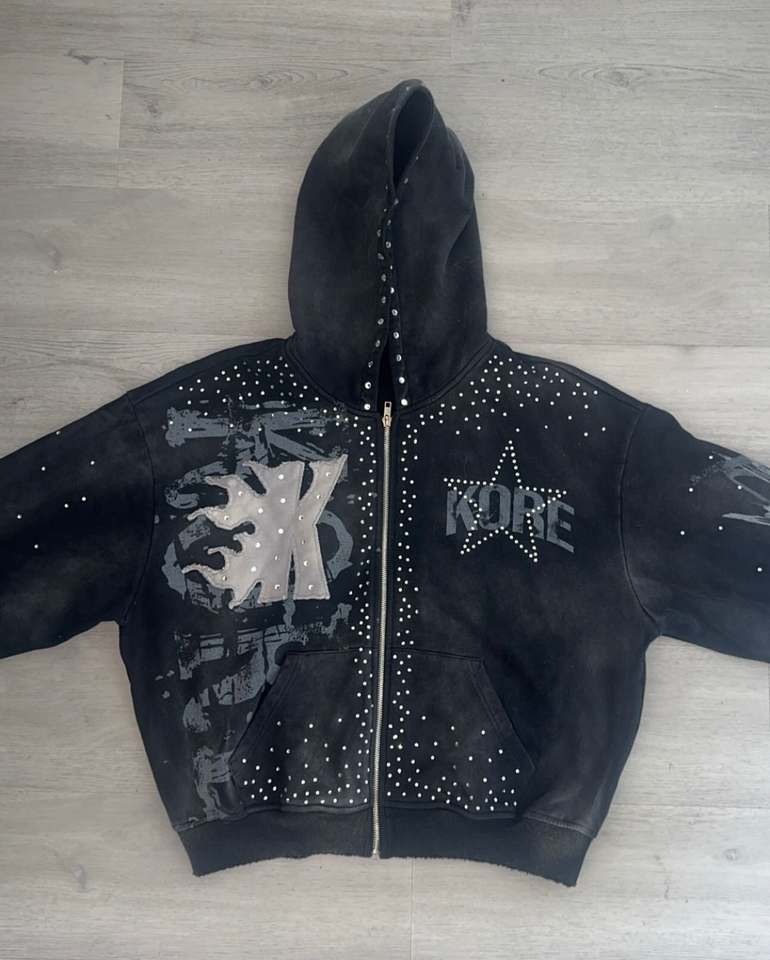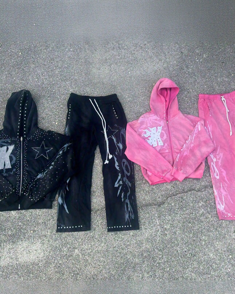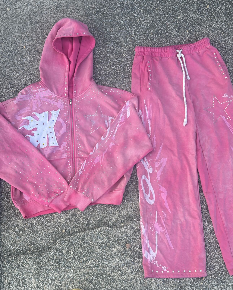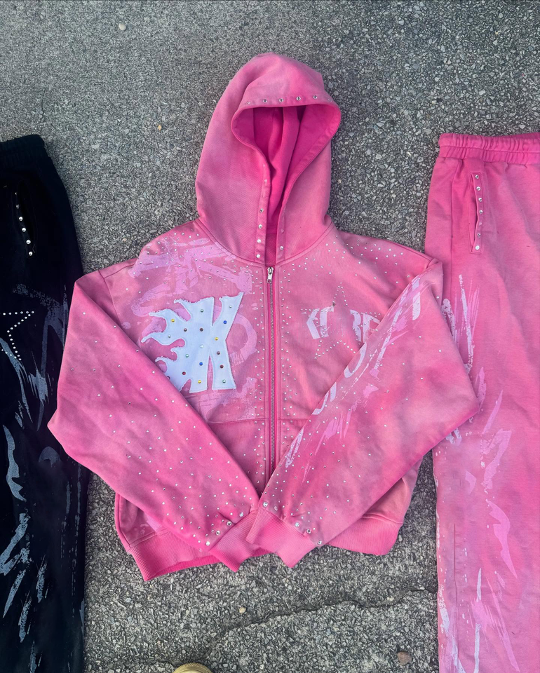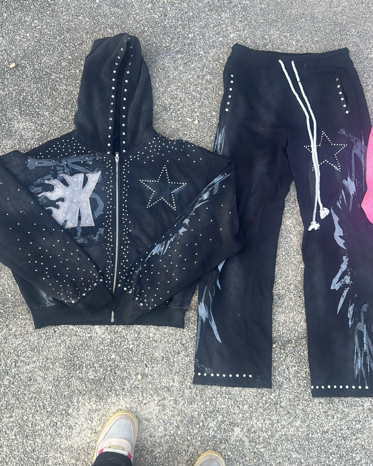 Chándal personalizado con aplicaciones y serigrafía de logo, French Terry 100% algodón pesado, sudadera con cremallera y capucha con strass, pantalón con cordón, lavado ácido