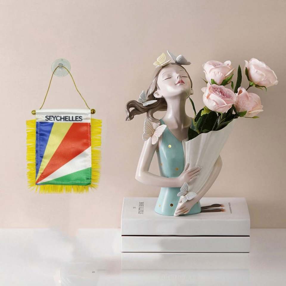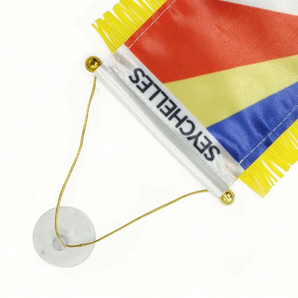 Bandera Miniatura Personalizada para Automóvil de las Seychelles, en Satén, Poliéster y Plástico con Borlas Amarillas, Impresión Digital