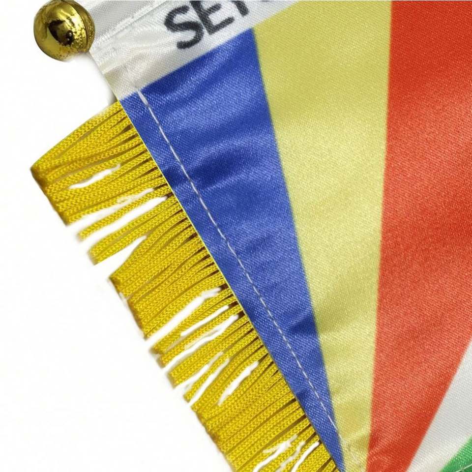 Bandera Miniatura Personalizada para Automóvil de las Seychelles, en Satén, Poliéster y Plástico con Borlas Amarillas, Impresión Digital