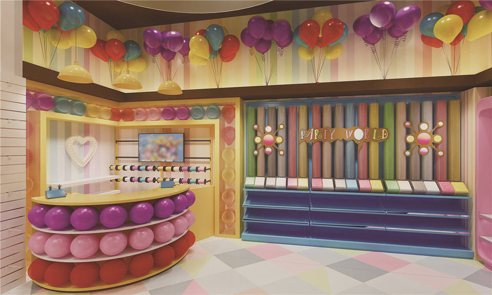 Tienda de regalos de globos personalizada, muebles de exhibición, tienda de juguetes para niños, diseño de interiores, decoración de tienda de fiesta de disfraces de moda