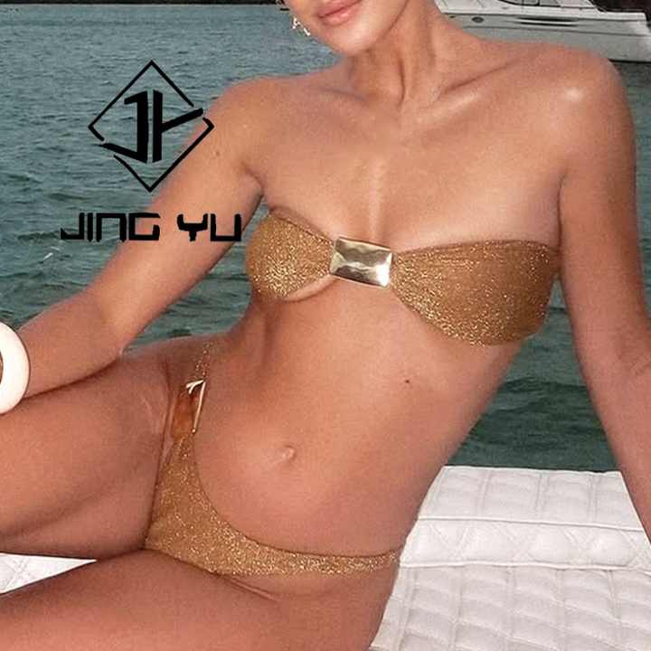 Bikini Personalizado con Accesorios Metálicos Brillantes, Traje de Baño Bandeau, OEM, Micro Bikini de Poliéster de Alta Calidad