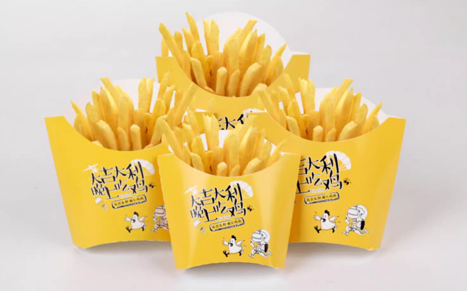 Caja Personalizada Biodegradable para Domicilio de Comida Caliente en Cartulina Marfil Amarilla para Embalaje de Alimentos y Pollo Frito