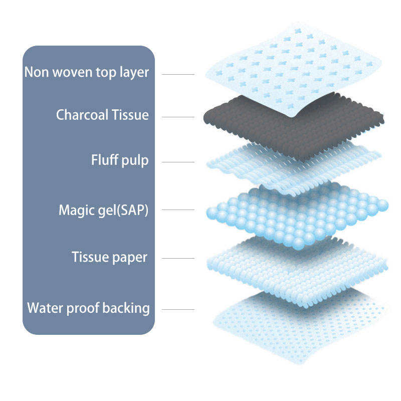 Materiales:Papel de carbón de bambú + pulpa de celulosa + SAP (polímero superabsorbente) + papel tisú + film de PE