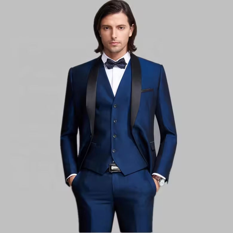 Trajes de Boda para Hombre de Alta Calidad, Color Azul Personalizado, Estilo Vintage, Traje de Tres Piezas con Solapa de Chal, Venta al por Mayor