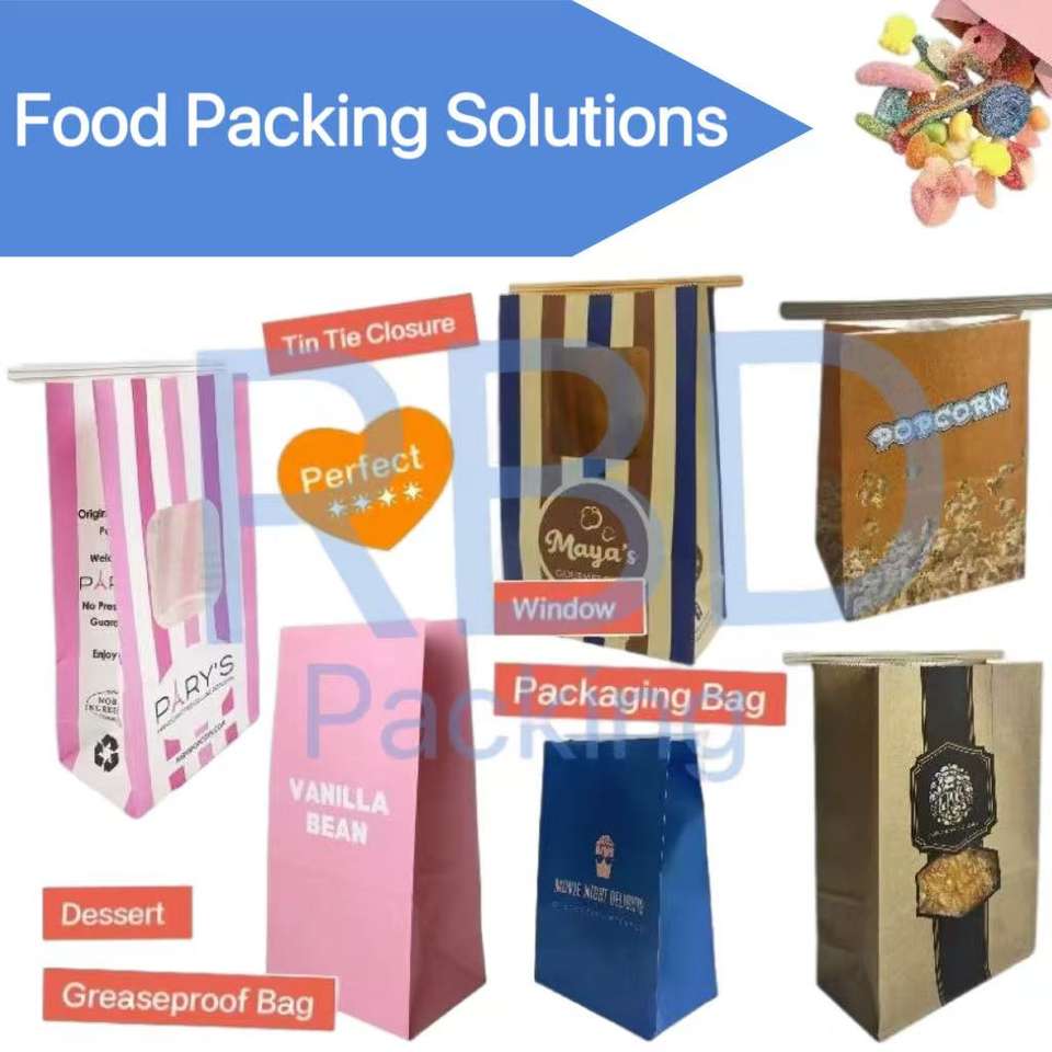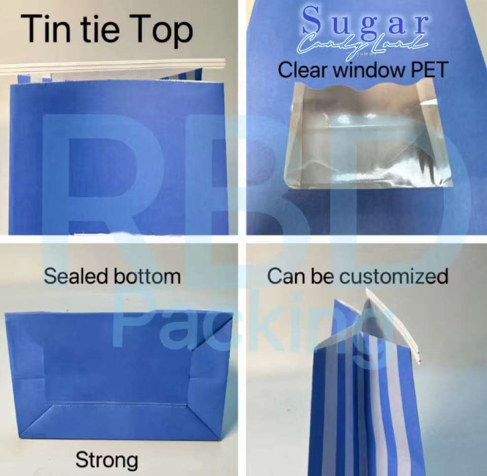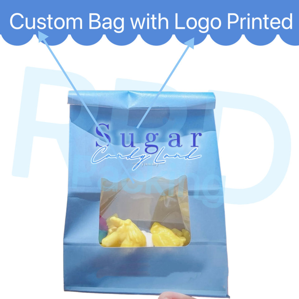 Empaquetado de repostería azul personalizado, dulces y dulces, venta al por mayor, bolsas de panadería con logotipo, ventana, bolsa de papel, barra de dulces, regalo, palomitas de azúcar