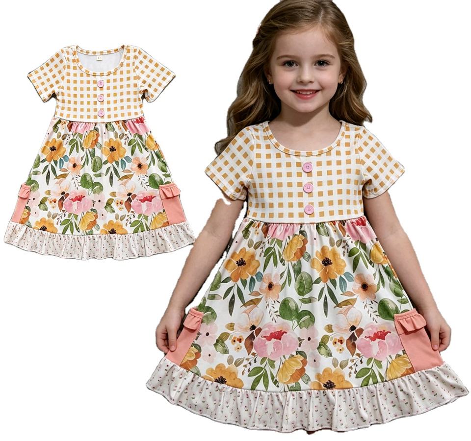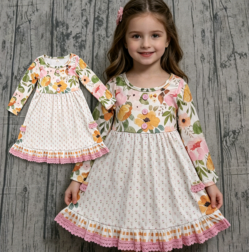 Vestido Infantil de Boutique Personalizado con Estampado Floral Otoñal, Estilo Línea A con Volantes, Venta al Por Mayor, Ropa Casual para Niñas