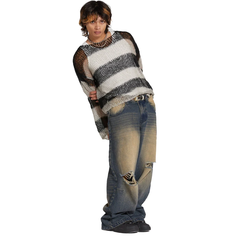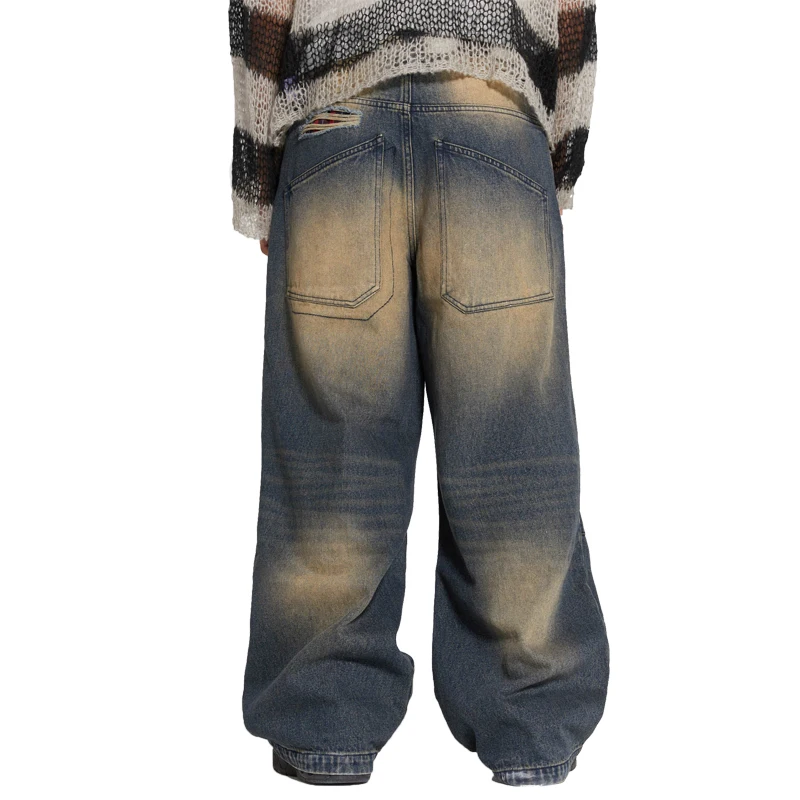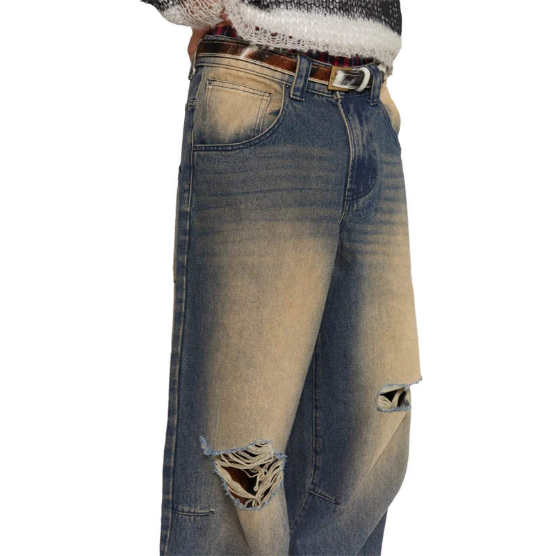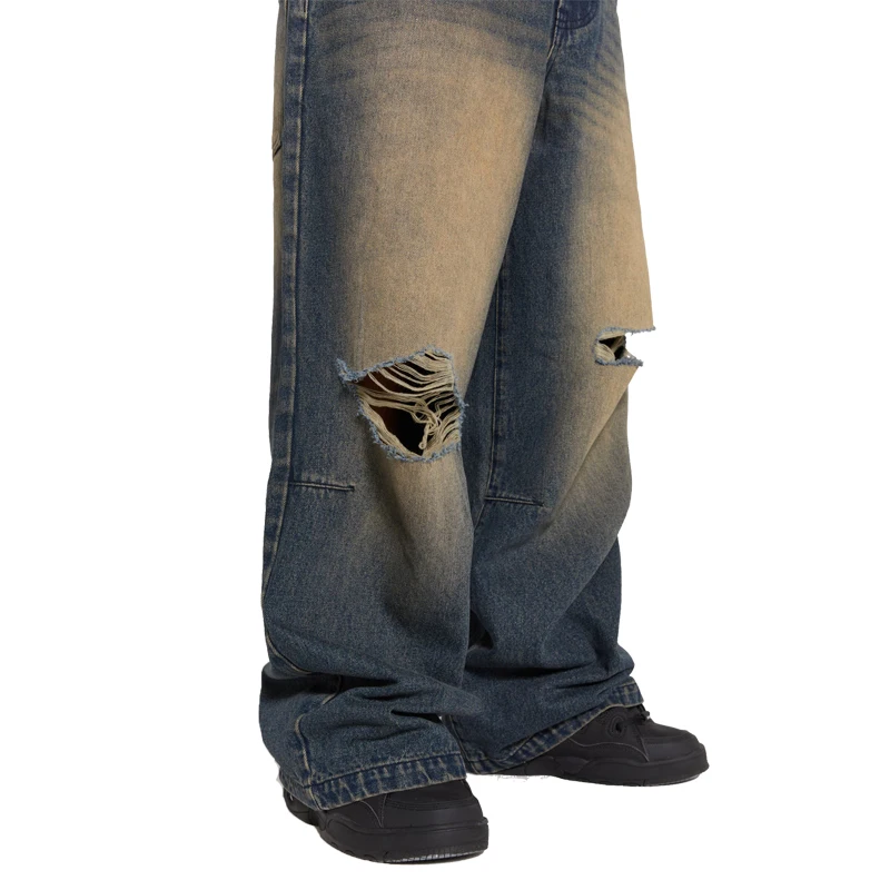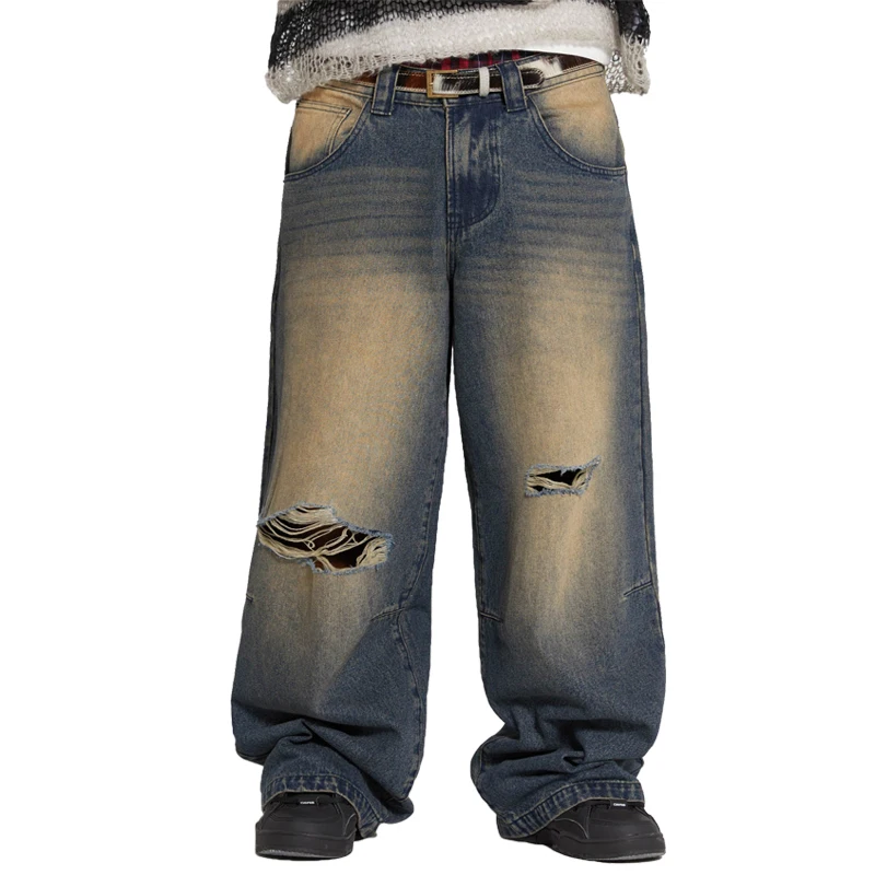 Custom Boys doble rodilla Rips no elástico Sandblast Denim Pants Mid-Rise Men Dirty Wash Vintage Jeans pantalones para hombres