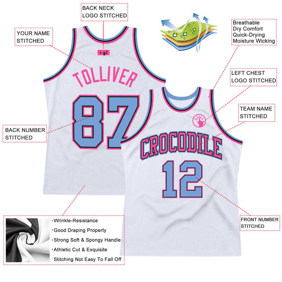 Conjunto de Uniforme de Baloncesto Retro Personalizado, Transpirable, Blanco, Azul Claro y Rosa, Auténtico, para Adultos, Ropa de Equipo Personalizada, 100%