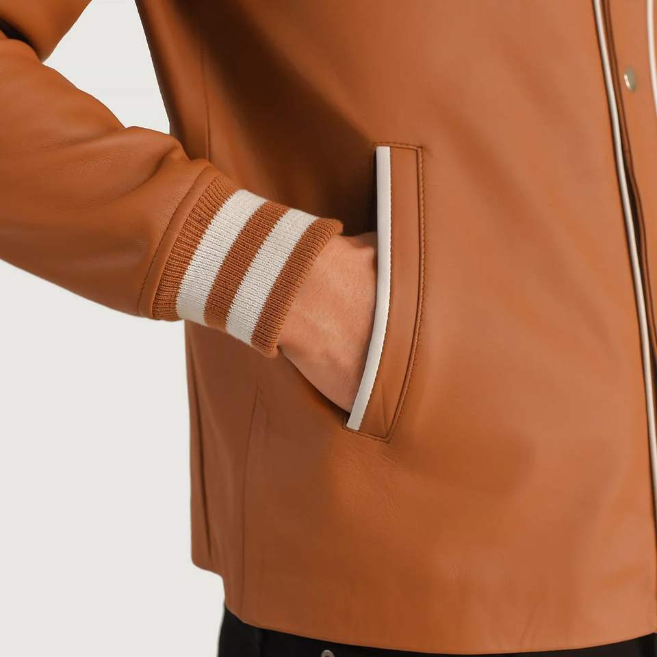 Chaqueta universitaria de cuero marrón personalizada para hombre, estilo de invierno informal con cuello levantado y logotipo con cierre de cremallera, servicio OEM disponible