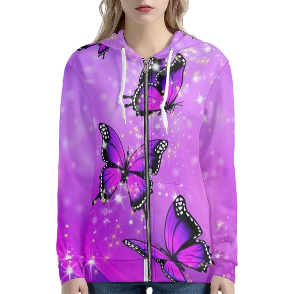 Sudadera con capucha con patrón de mosca de mantequilla personalizada, sudadera con cremallera de alta calidad de forro polar de algodón con estilo cálido y cómodo para mujer