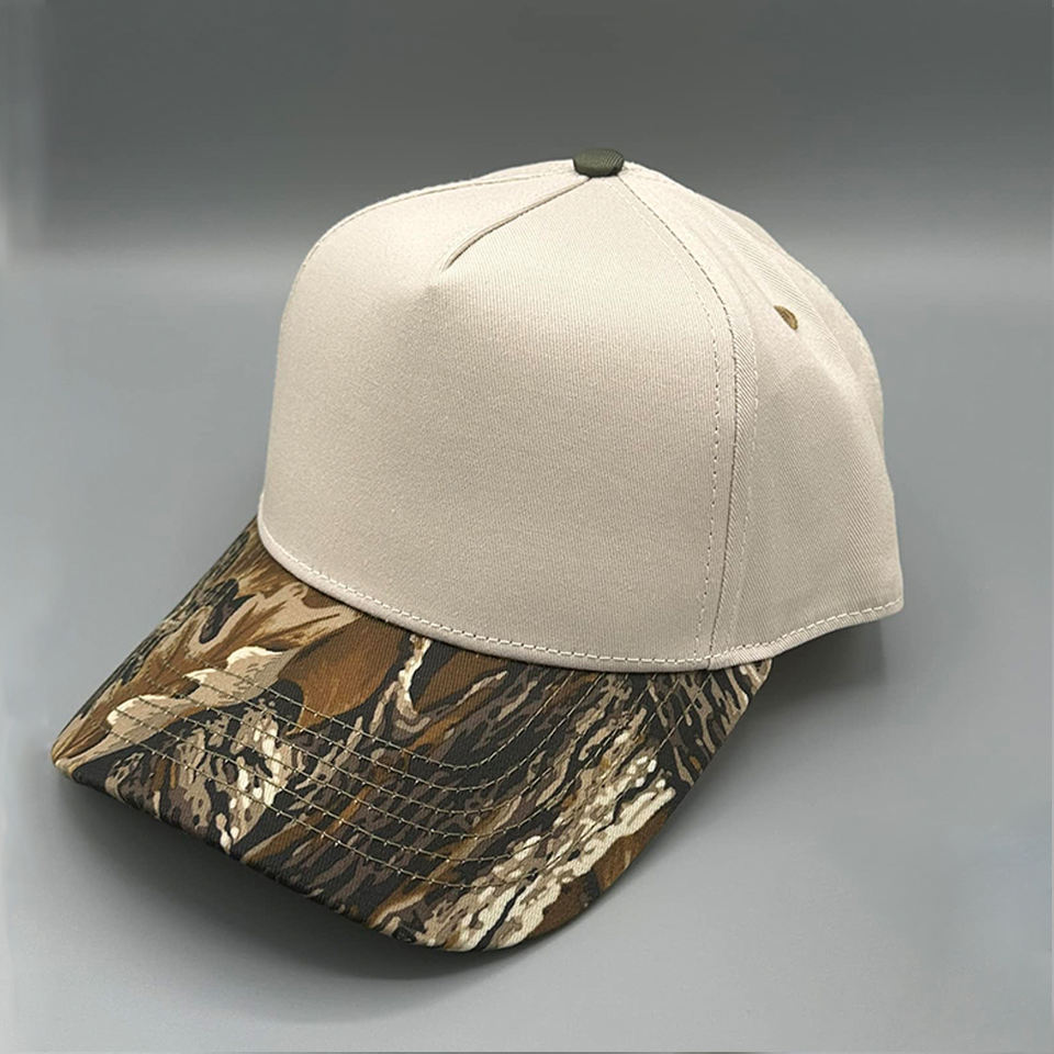Gorra de béisbol blanca de sarga de algodón con estilo de marco personalizado de camuflaje de 5 paneles con bordado en relieve 3D gorras de béisbol de dos tonos