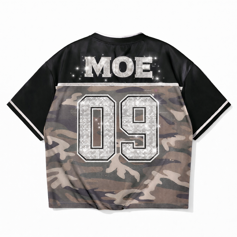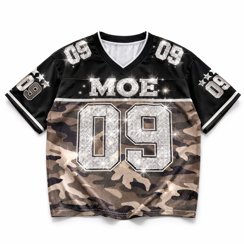Uniforme de Equipo Femenino Personalizado con Camuflaje, Jersey de Fútbol Americano con Cuello en V y Pedrería, Malla de Poliéster 220GSM, Etiqueta Privada OEM, Venta al Por Mayor
