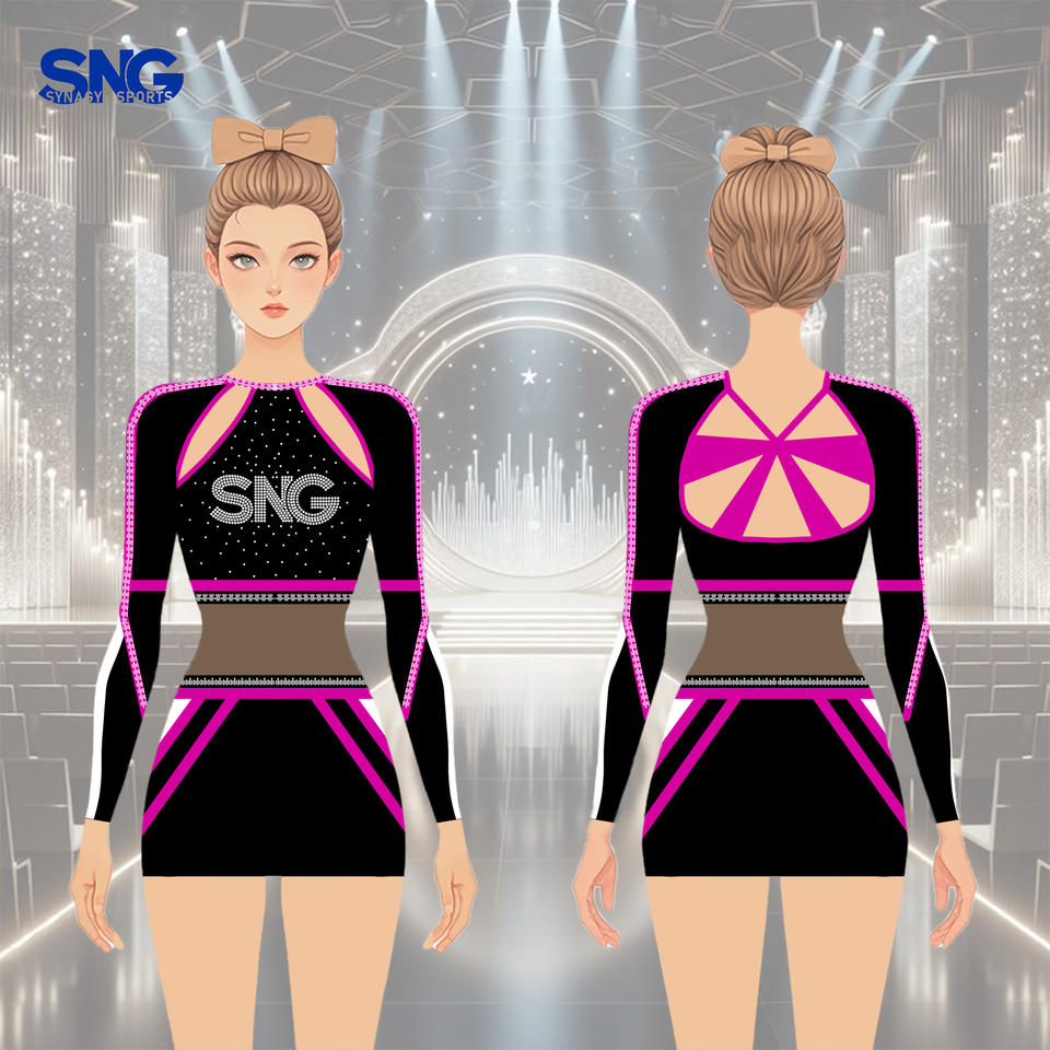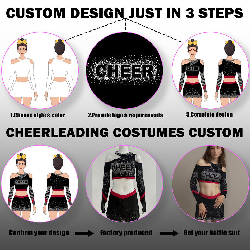 Uniformes personalizados de porristas para niñas, conjuntos adornados con diamantes de imitación con servicio OEM de poliéster de impresión por sublimación