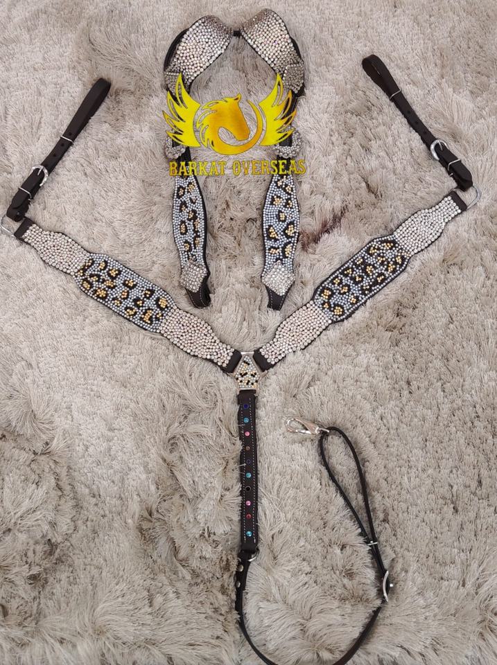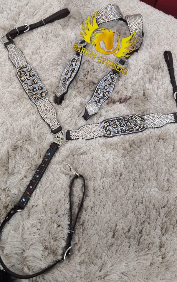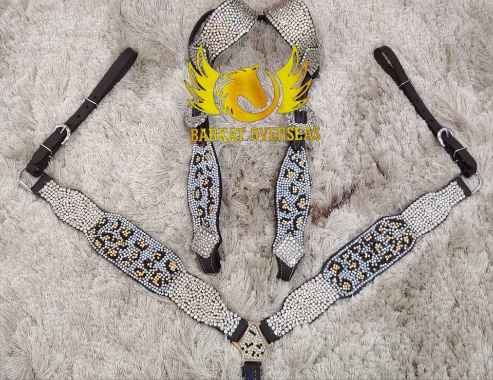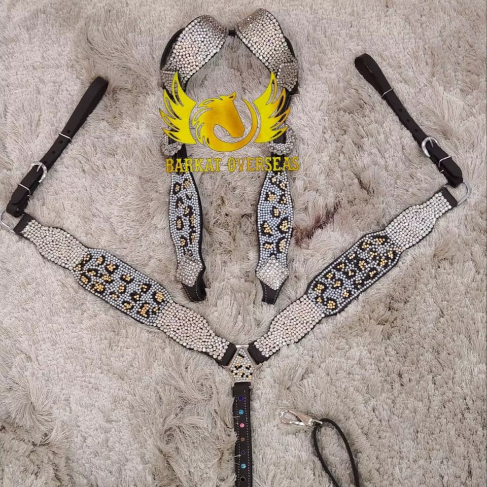 Conjunto de arreos para caballo de cuero genuino con pedrería de cristal de guepardo personalizada, ligero y de temporada, para un equipamiento cómodo de equitación.
