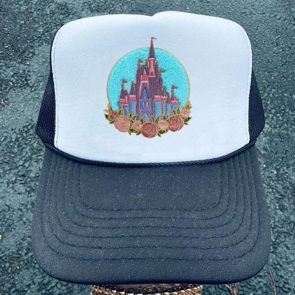 Parche Bordado de Chenilla Personalizado con Diseño de Castillo, Borde Dorado y Flores de Rosa, Parches Termoadhesivos para Ropa, Apliques de Estilo de Cuento de Hadas para Bolsos