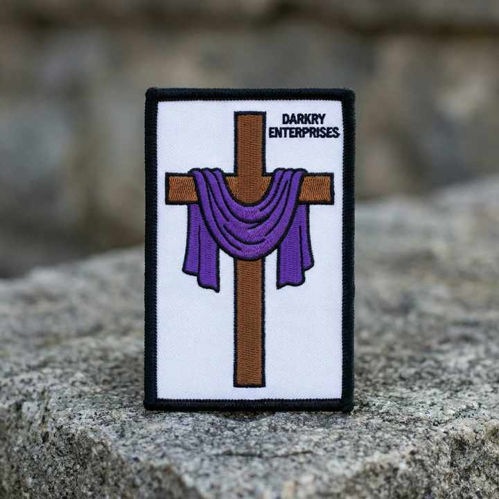 Parche Bordado Termoadhesivo Personalizado con Cruz Cristiana Morada, Insignia Táctica para Uniforme, Emblema Religioso de Pascua