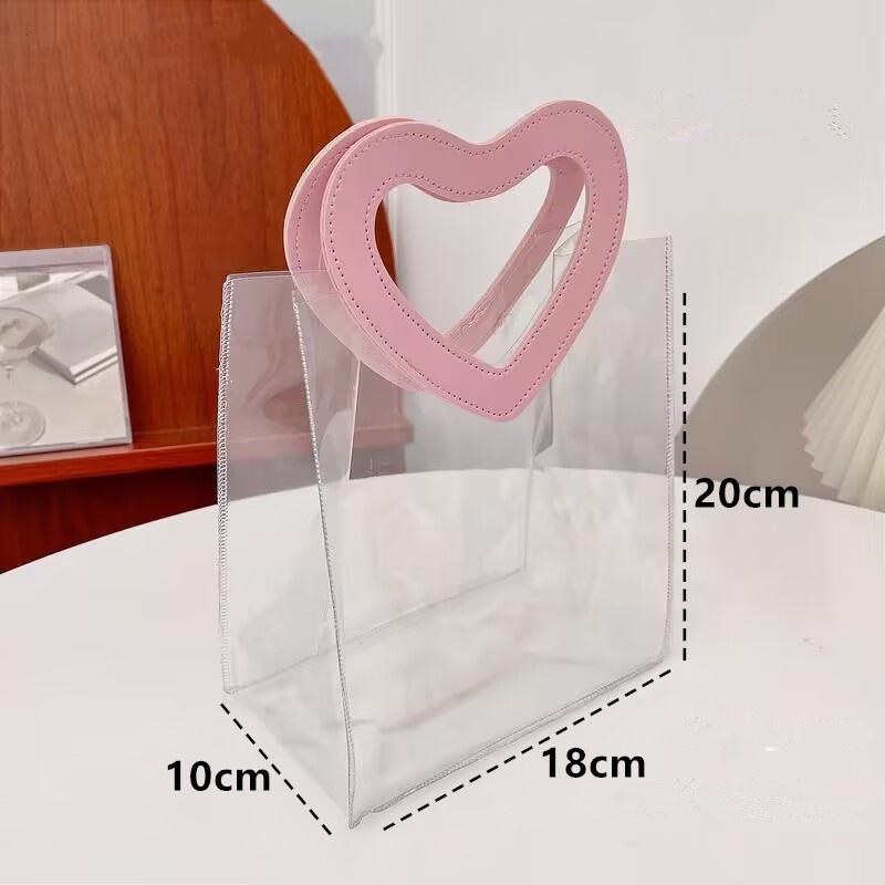 Bolsas de regalo de plástico transparente personalizadas, bolsa de papel de regalo de PVC con asas de cuero en forma de corazón para recuerdo de boda