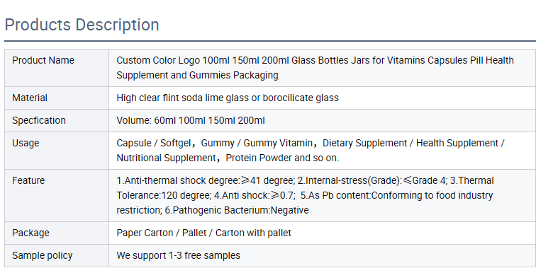 Envase de Vidrio Personalizado con Logotipo a Color de 100 ml, 150 ml, 200 ml para Cápsulas de Vitaminas, Polvo Liofilizado, Péptidos y Gomitas