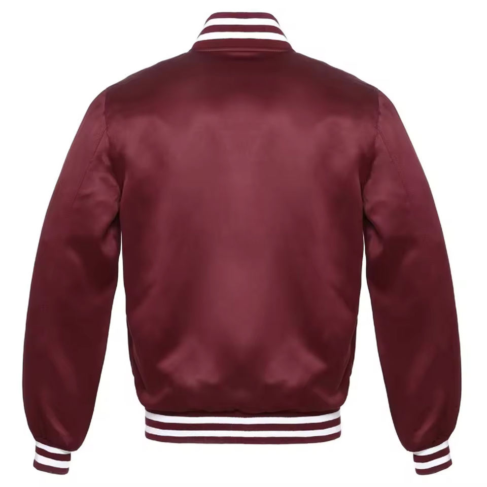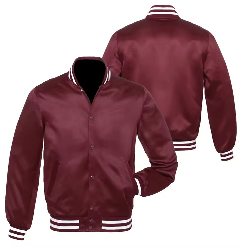 Satén de color personalizado último diseñador Varsity chaquetas Casual chaqueta de béisbol Letterman abrigo de seda Unisex Stand Collar